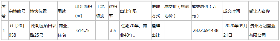 貴州萬冠置業有限公司2822.69萬元摘得G〔20〕058地塊。