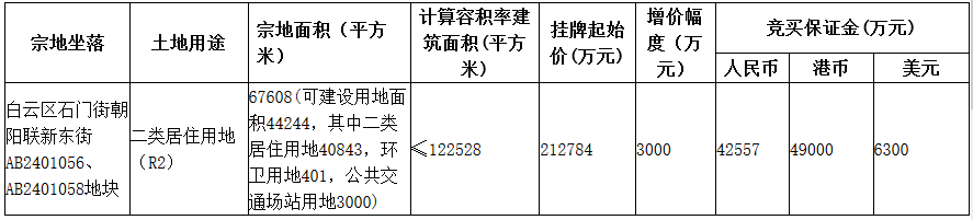 資料显示,該地塊公告號為穗規劃資源掛出告字〔2020〕79號,位於白雲區石門街朝陽聯新東街AB2401056、AB2401058地塊。宗地面積67608㎡,可建設用地面積44244㎡,其中二類居住用地40843㎡,環衛用地401㎡,公共交通場站用地3000㎡;計容建築面積≤122528㎡,起始價212784萬元,起拍樓麵價22997元/㎡(扣除配建面積),最高限價308536萬元,競買保證金42557萬元,增加幅度3000萬元。