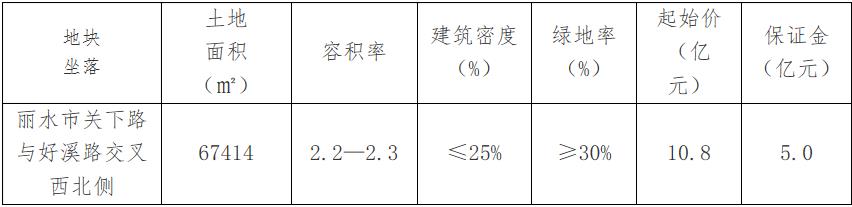 地塊編號麗土告字〔2020〕39號,地塊名稱麗水市關下路與好溪路交叉西北側地塊,出讓面積6.74萬平,用途為商住用地,容積率為2.3,建築面積15.5萬平,起始價10.8億元。