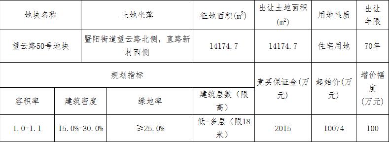 地塊編號諸市自然告字[2020]28號,地塊名稱望雲路50號地塊,出讓面積1.41萬平,用途為住宅用地,容積率1.1,建築面積1.55萬平,起始價1億元。