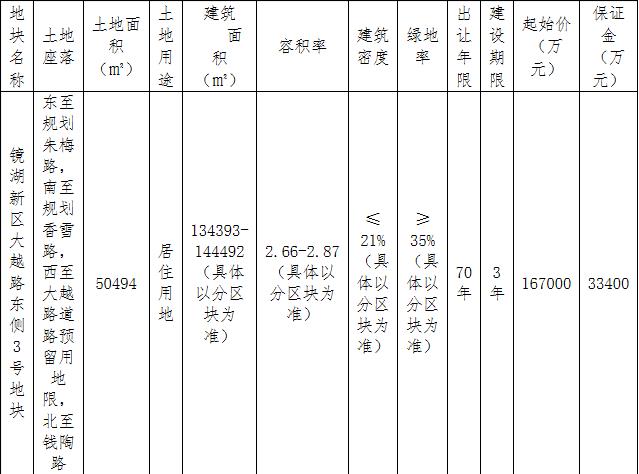 地塊編號紹市自然告字[2020]45號,地塊名稱鏡湖新區大越路東側3號地塊,出讓面積5.04萬平,用途為住宅用地,容積率2.86,建築面積14.44萬平,起始價16.7億元。