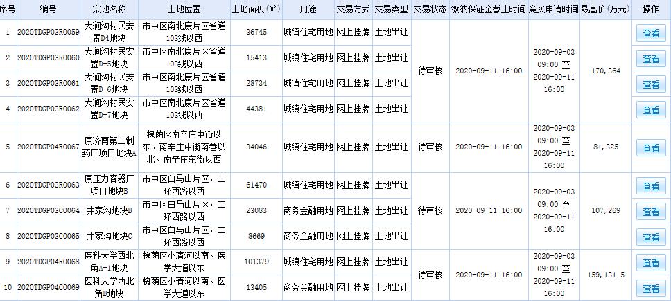 地塊編號2020TDGP03R0061,地塊名稱大澗溝村民安置D-6地塊,地塊位於市中區南北康片區省道103線以西,土地用途為住宅用地,1.5≤地上容積率≤2.4,出讓年限七十年,起始價3.8億元。