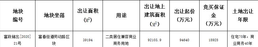 地塊編號富政儲出[2020]21號,地塊名稱富春70-2號地塊,出讓面積3.91萬平,用途為商住用地,容積率2.35,建築面積9.21萬平,起始價9.46億元。
