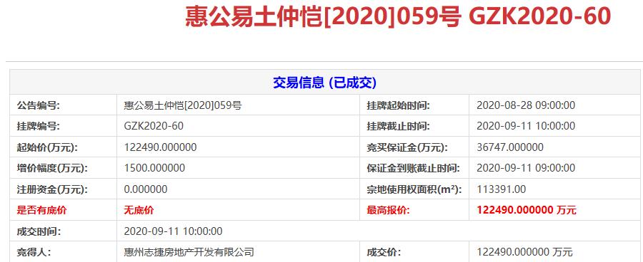 中國網地產訊 9月11日,惠州仲愷區1宗城市更新地塊成功出讓,最終惠州志捷開發有限公司(星河控股)以底價12.25億元競得,成交樓麵價約2604元/㎡。