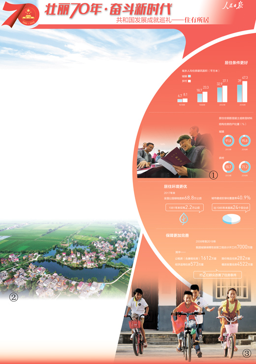 70年砥礪奮進,70年築夢前行,我國住房建設蹄疾步穩,住房保障體系不斷完善。從“憂居”到“有居”,2018年,城鄉居民人均住房建築面積比1978年增長4.8倍。從“有居”到“宜居”,曾經的土坯房、平房、筒子樓已成為記憶,城鄉居民居住在鋼筋混凝土或磚混材料結構住房的戶分別佔到95.8%、71.2%,越來越多的人住進自己溫馨舒適的家,用上現代化家電,享受現代服務,真切體會到滿滿的獲得感、幸福感、安全感。