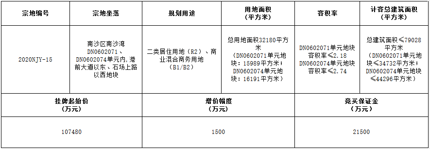 資料显示,該地塊編號為2020NJY-15,位於南沙區南沙灣DN0602071、DN0602074單元內,港前大道以東、石場上路以西。佔地面積32180平方米,其中DN0602071單元地塊容積率≤2.18,DN0602074單元地塊容積率≤2.74,地塊整體計容建面79028平方米。起始價107480萬元,起拍樓麵價13600元/㎡,最高限價136160萬元,競買保證金21500萬元,增加幅度1500萬元。