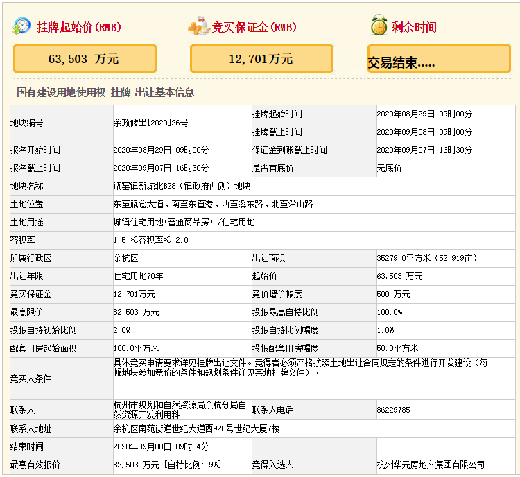 中國網地產訊 8日,杭州餘杭區出讓一宗宅地,起始價63503萬元。最終,該地塊由杭州華元集團有限公司以最高限價82503萬元、自持住宅屋面積比例9%競得,溢價率29.92%。
