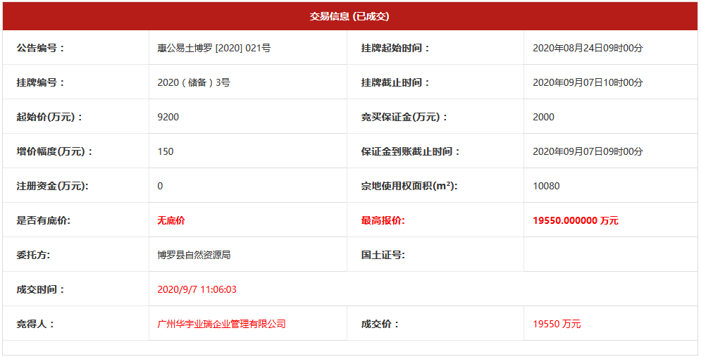 廣州華宇業瑞企業管理有限公司(重慶華宇)以19550萬元競得2020(儲備)3號地塊,樓麵價約6256元/㎡,溢價率112.5%。