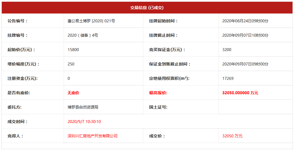 其中,深圳興匯開發有限公司()以32050萬元競得2020(儲備)4號地塊,樓麵價約5987元/㎡,溢價率102.85%。