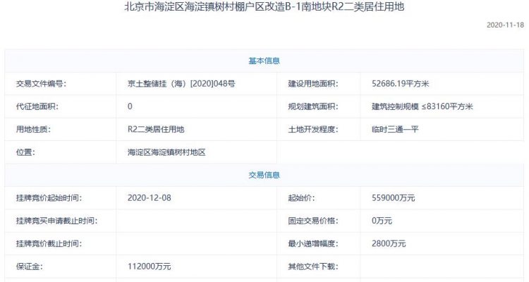 北京海淀118億元掛牌2宗不限價地塊 起始樓麵價超6.7萬/平